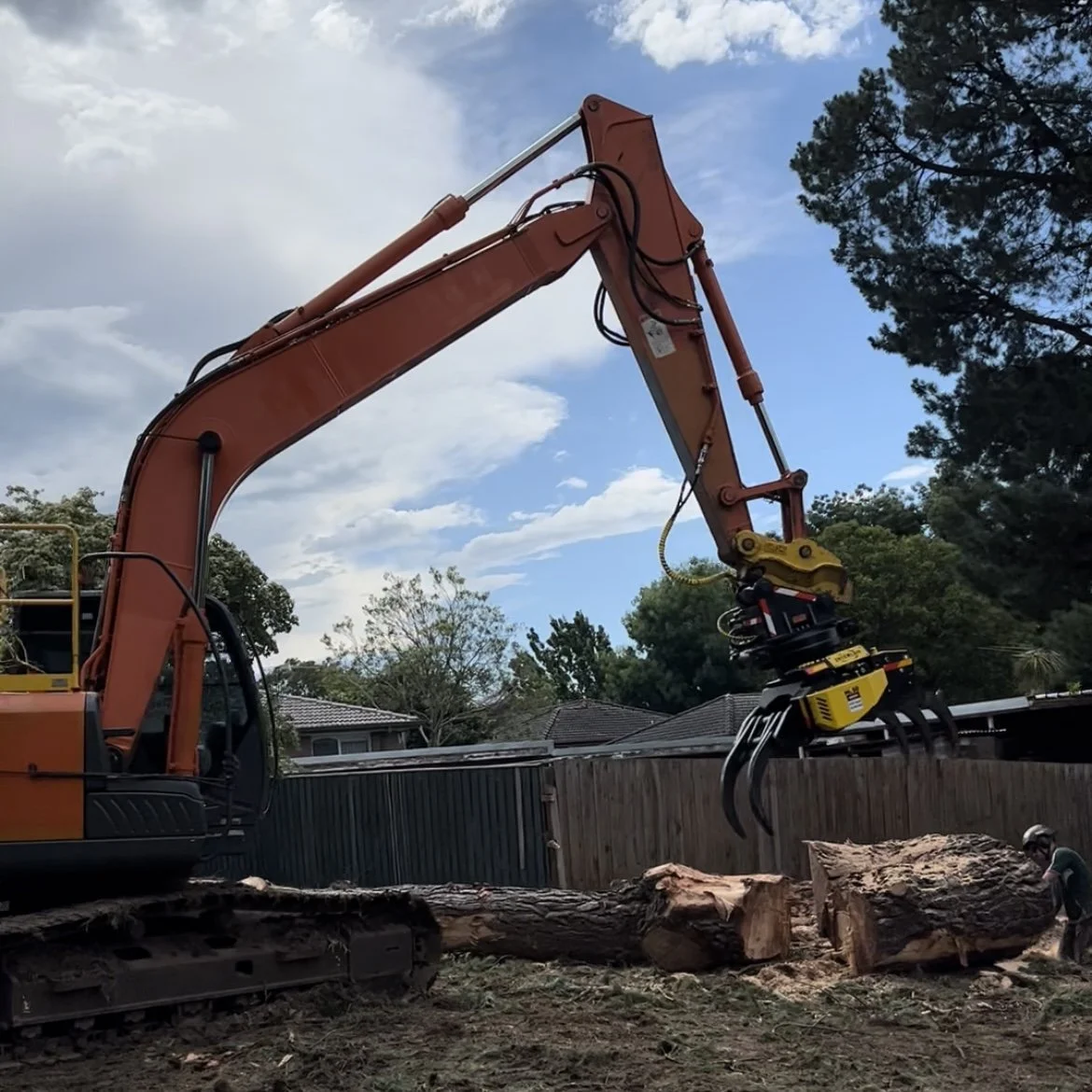 What is this magnificent machine, you ask? Well, it's like the lovechild of an excavator and a grapple-saw. It's big, it's strong, it's fast, and it's a lean, mean tree-removing and timber up-cycling machine.